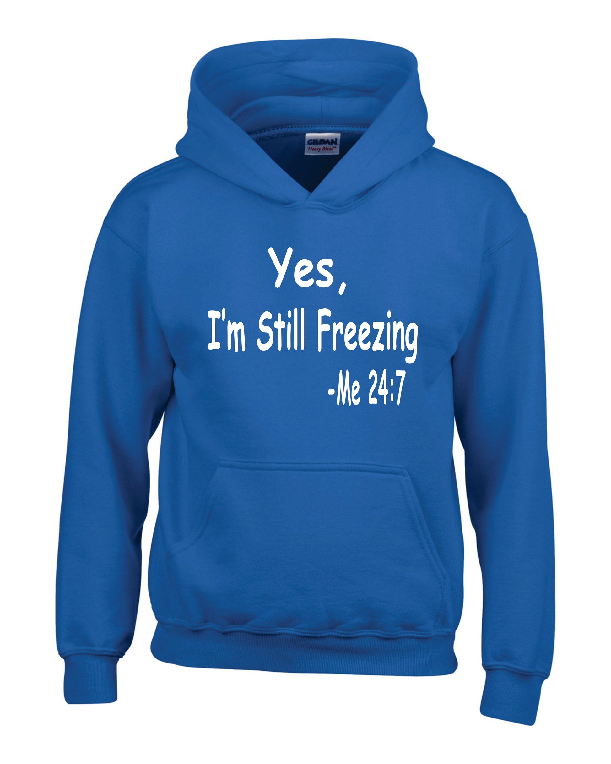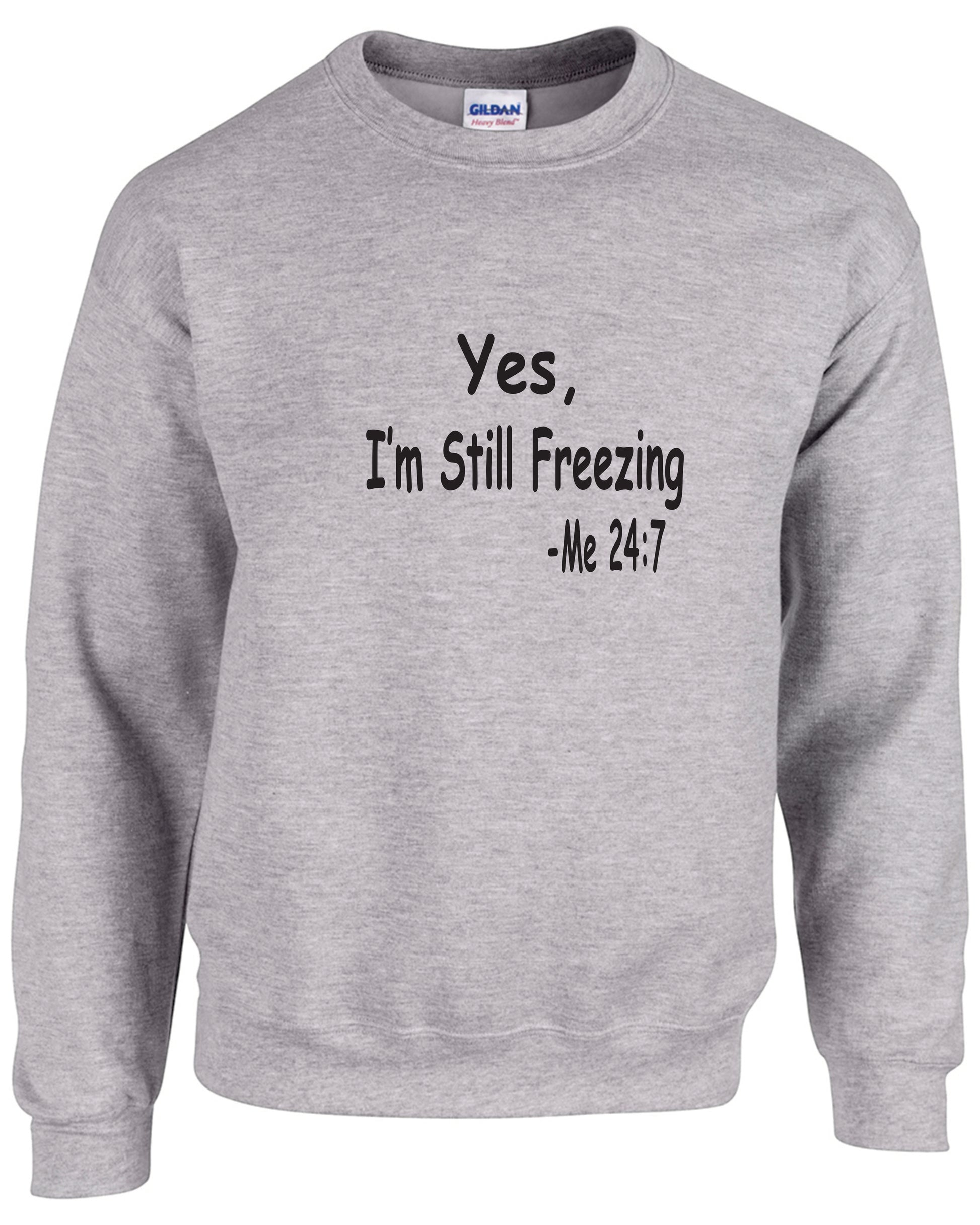 Gildan Hoodie or Crewneck with Yes, I'm Still Freezing, Me 24:7 Graphic